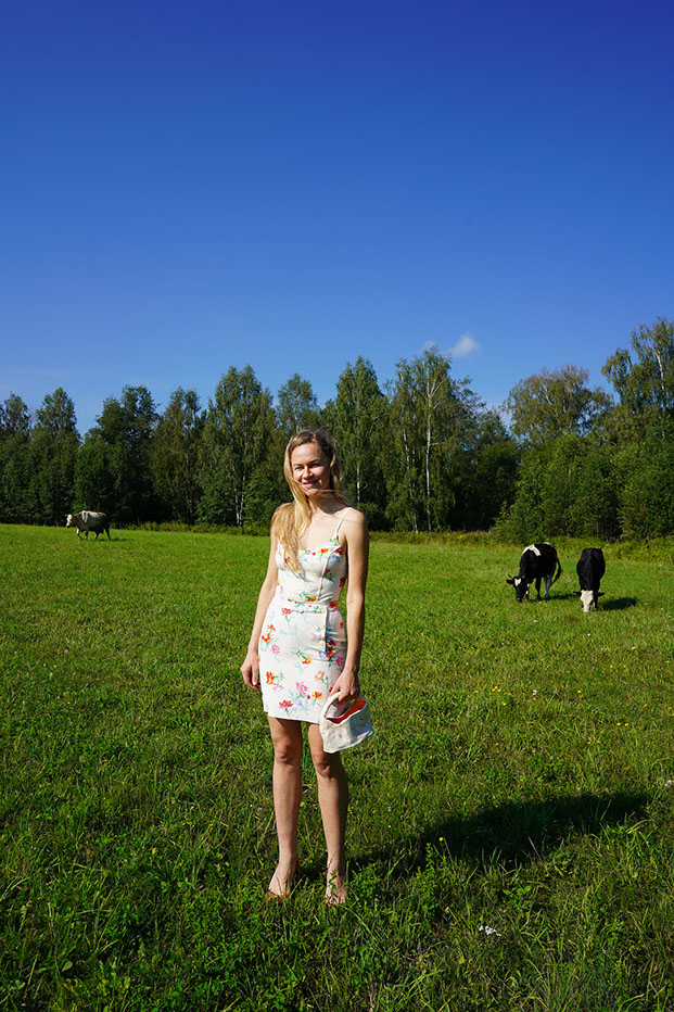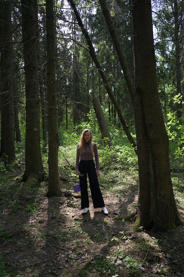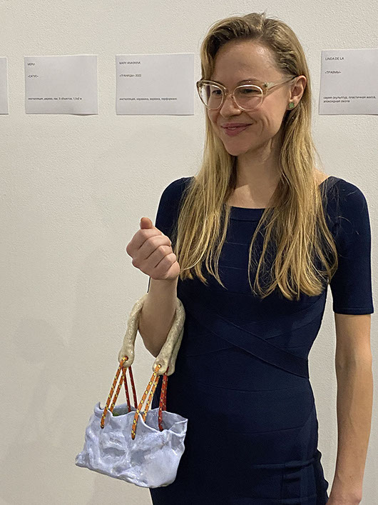 Mary Anaskina at Start Gallery show opening 'Okay, I'll think about it' with MALKENZA bag.